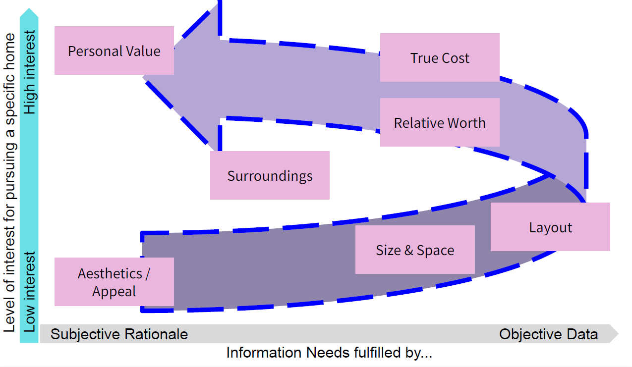 Using the findings from the diary study and previous research on experience outcomes, I was able to derive a strong model that can predict tour outcomes. More importantly, I discovered the shopper’s definition of a successful tour was not tied to making an offer on the home.